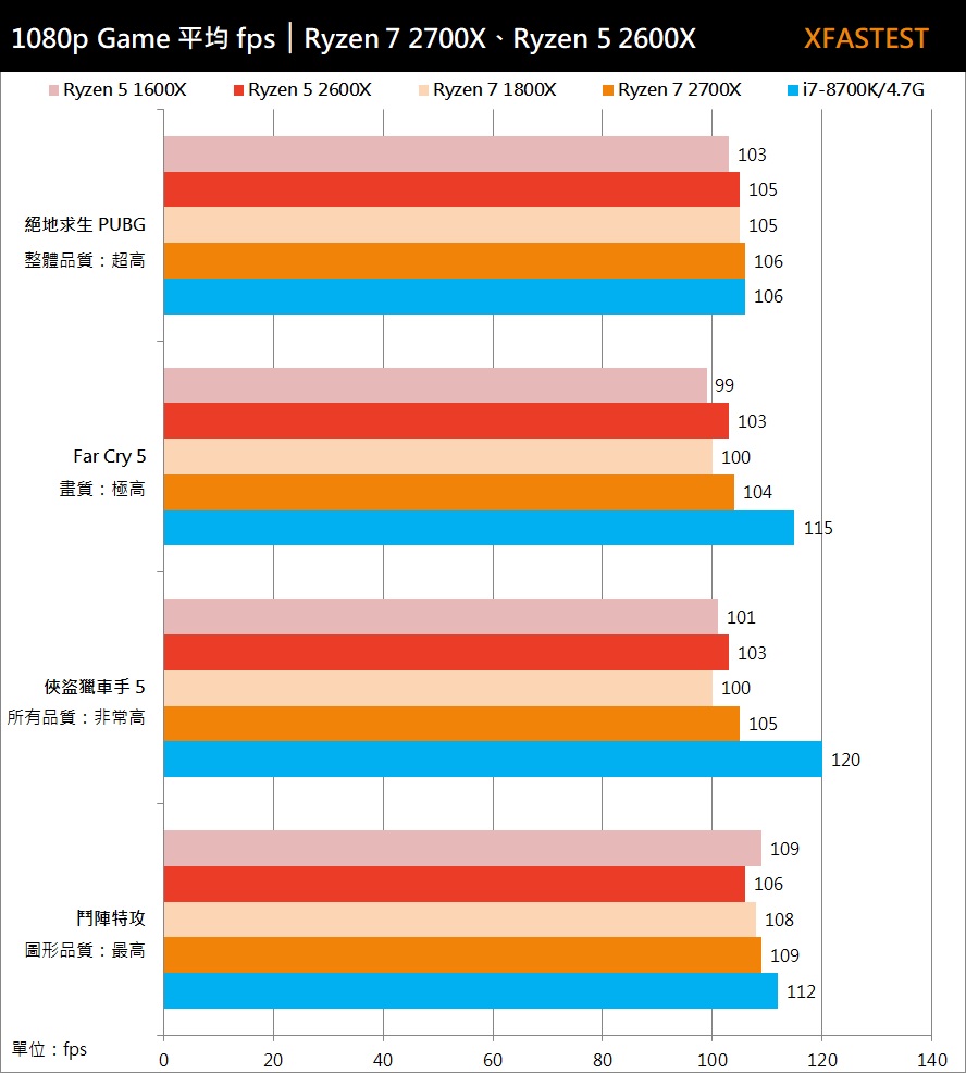 新推出的《Far Cry 5》状况相同,R7 2700X与R5 2600X与i7-8700K相比性能接近差距在10 fps不到,而整体平均性能亦有着104 fps;至于很夯的《绝地求生PUBG》,则大家都在平均100 fps左右。