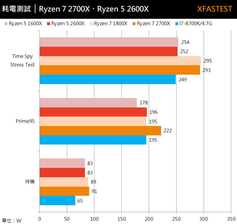 整平台功耗测试,Time Spy Stress Test模拟运行游戏时的测试,R7 2700X与1800X功耗最高295W,而R5 2600X与1600X则相近254W;改用Prime95针对CPU压力测试,可见R7 2700X整平台功耗来到222W,比起1800X的195W还要高,至于R5 2600X则来到与1800X相近的功耗。