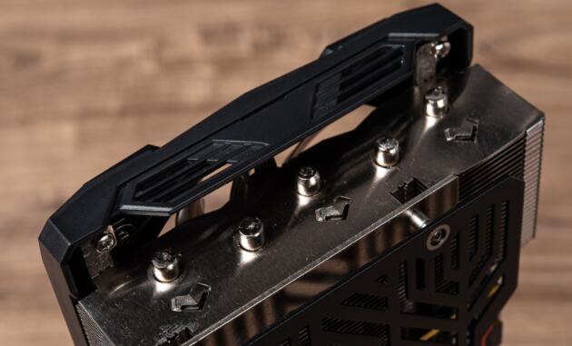 而散热鳍片也具备V形开孔,让风扇气流更容易带入鳍片内部,并将废热往显卡两侧推出。