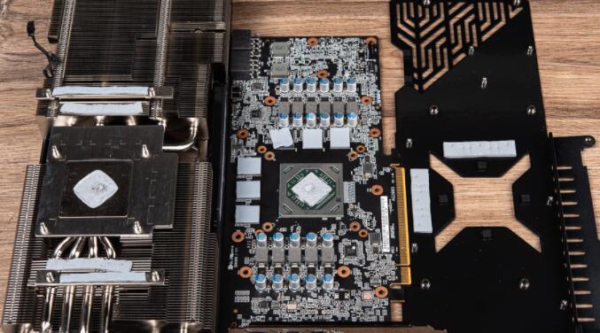 显卡拆解可见散热器、PCB电路板、金属背版与金属框架;RX 6700 XT Phantom Gaming D 12GB OC使用Navi 22 GPU为7nm、RDNA 2构架,有着2560个流处理器,而周围6颗GDDR6內存组成12GB容量。