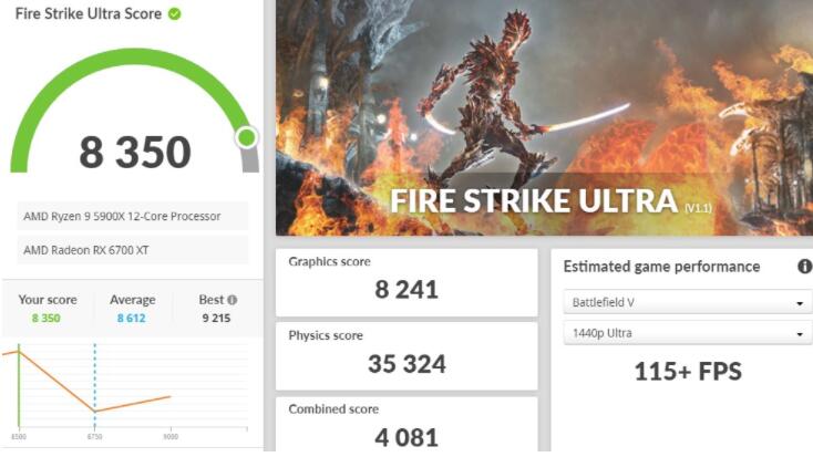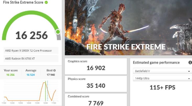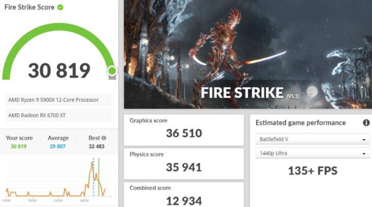 3DMark Fire Strike测试,锁定DirectX 11 API的AAA游戏性能表现,在主流的1080p分辨率Fire Strike测试,ASRock RX 6700 XT Phantom Gaming拿下30,819分,而1440p的Extreme则有16,256分,更高4K 2160p分辨率的Ultra测试则获得8,350分。