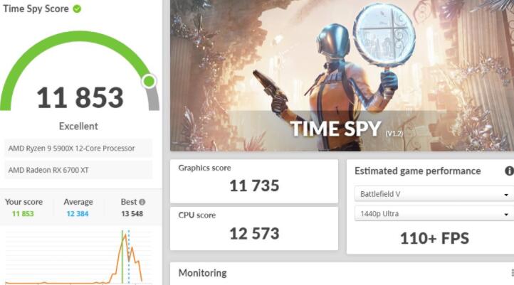 3DMark Time Spy则是采用DirectX 12 API所设计的测试情境,同样是锁定在AAA游戏等级。在1440p的Time Spy测试上,ASRock RX 6700 XT Phantom Gaming获得11,853分,而Extreme则获得5,711分的成绩。
