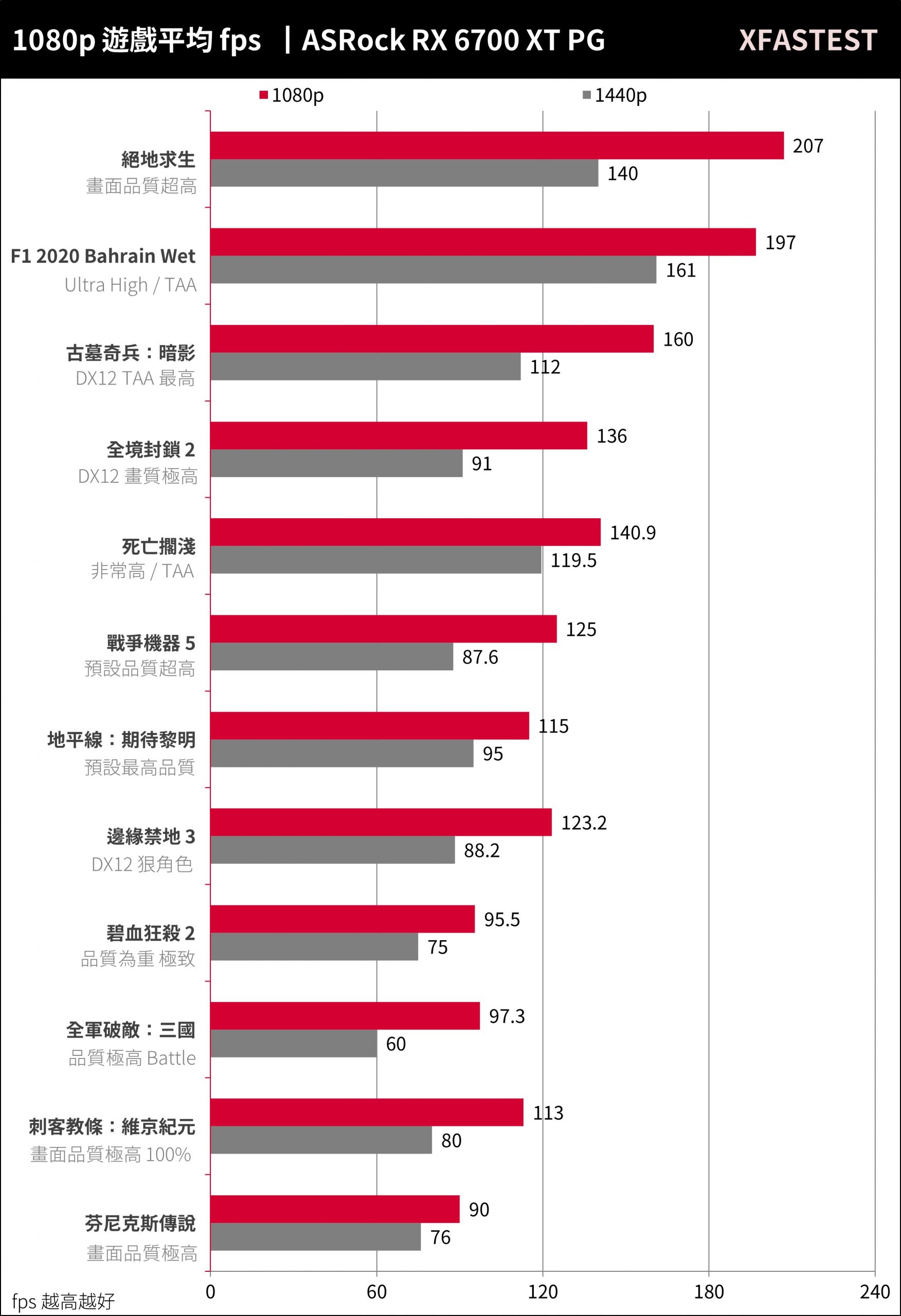 而在1440p分辨率下,也都可维持在60 FPS+的性能表现,即便吃资源的《碧血狂杀2》平均75 FPS、《刺客教条:维京纪元》平均80 FPS的表现;RX 6700 XT Phantom Gaming有着足够的性能满足1440p与1080p分辨率的AAA游戏玩家。