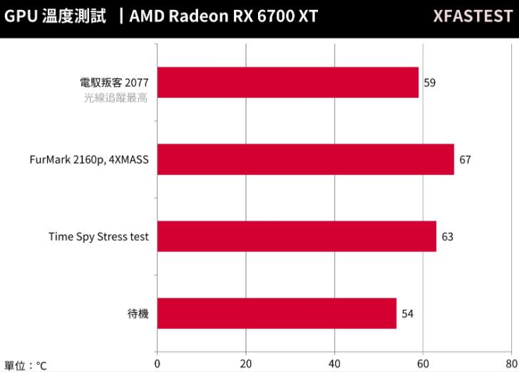 待机时RX 6700 XT Phantom Gaming具备0dB风扇,因此GPU待机温度较高54°C,而在Time Spy Stress test GPU温度63°C,最高则在FurMark测试下达到67°C,不过游戏时温度固定在59°C的表现可说是相当不错。