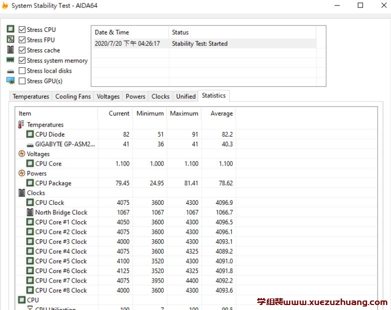 AIDA64烧机28分钟测试,CPU Die温度平均在82.2度,全核心频率约在4100MHz上下,整体功耗145W