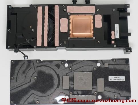散热器解体图,纯铜微水道冷头对GPU散热,电源控制芯片、VRMs和內存连接到散热片透过风扇散热,水冷头背板对应GPU和內存都有厚实导热胶片。