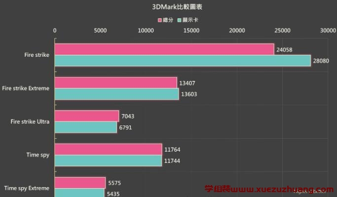 3DMARK跑分,有总分和显卡分数。Fire strike 24058、28080Fire strike Extreme 13407、13603,Fire strike Ultra 7043、6791,Time spy 11764、11744,Time spy Extreme 5575、5435。