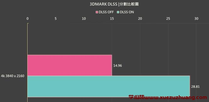 3DMARK DLSS测试4K FPS,DLSS OFF 14.96 FPS,DLSS ON 28.81 FPS。