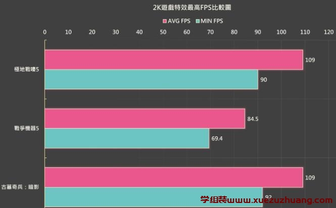 2K 2560 x 1440分辨率游戏特效最高FPS测试,极地战嚎5 AVG 109、MIN 90 FPS,战争机器5 AVG 84.5、MIN 69.4 FPS,古墓奇兵:暗影AVG 109、MIN 92 FPS。