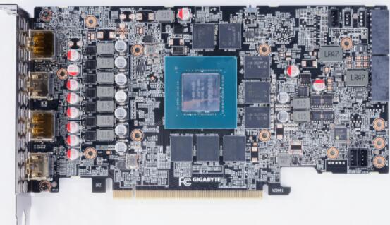 PCB正反面一览,初技嘉在这回导入全自动化制程设计,同时在中阶卡RTX 3060 Ti系列当然也一样,可以看到板卡上在以往会使用的DIP形式的电容皆已改为SMD形式,并且料件上在GPU供电的MOSFET元件全采高整合的DrMOS元件用料,带给创作者最佳的用料与稳定性。