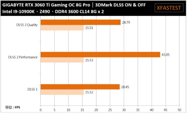 3DMark同时也有着NVIDIA DLSS feature test的测试项目,我们这回测试4K(2160p)的分辨率,测试项目包含DLSS 1、DLSS 2 Performance、DLSS 2 Quality,并比较关闭与开启的性能差异。