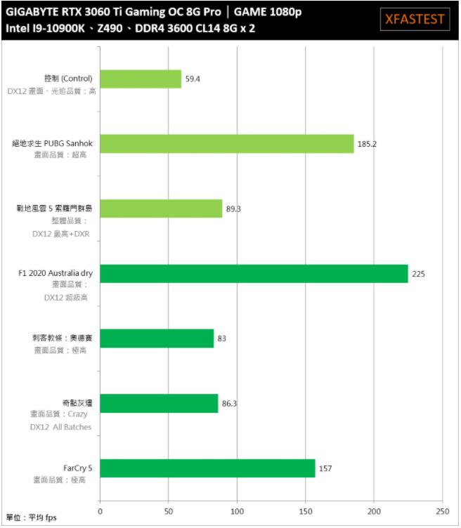 在游戏测试方面,这次我们选用了几款游戏,包含对性能相对要求较低的电竞游戏与对特效要求较高的一些大作,包括《绝地求生(PUBG)》、《战地风云5》多人联机、《刺客教条:奥德赛》、《FarCry 5》、《控制(Control)》、《奇点灰烬》、《F1 2020》来进行游戏性能测试。分辨率均采用1080p来进行,各游戏的特效如内所示。并以图表呈现来让玩家们可以一眼得知各种游戏的表现如何。