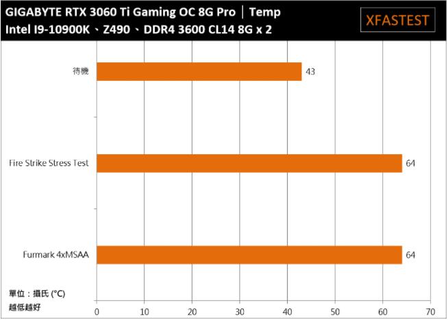 在温度测试下,烧机最高温为64度,这个表现当然也是相当亮眼,毕竟GIGABYTE RTX 3060 Ti Gaming OC 8G Pro搭载的散热器几乎可以说是跟自家的RTX 3070相近。