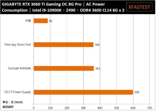 在功耗方面,单纯对显卡进行负载最高为363W,整机功耗为599W。如果用户有搭配高阶的CPU,例如本次的I9-10900K并有解锁PL了话,情况允许还是建议各位搭配至少650W以上、大厂可靠的电源供应器。