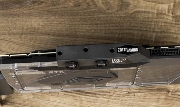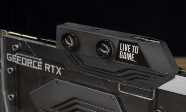 最后看到显卡的界面,除了后方有标准的3个DisplayPort 1.4a与1个HDMI 2.1界面外,前方也有ZOTAC一贯的6-PIN灯效界面,并能用配件的线材转成通用的3-Pin界面。灯效部分除了整块水冷区域发光外,因为压克力板上有激光电雕的线条,让整体不那么单调。