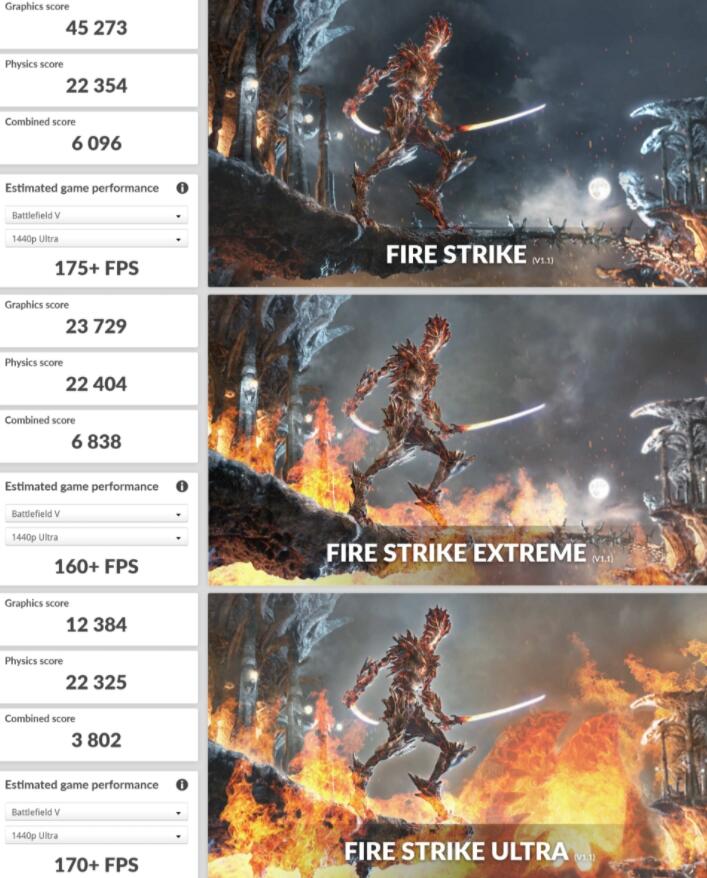 3DMark Fire Strike测试,是模拟基于DirectX 11 API的游戏,将电脑在运行AAA游戏时的表现以分数化来评断。而3DMark Fire Strike、Extreme与Ultra分别在1080P、2K与4K分辨率下运行。ZOTAC GAMING GeForce RTX 3090 ArcticStorm在Graphics score上分别获得45273、23729与12384分。
