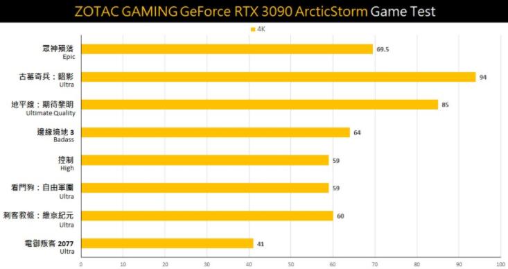 不过《电驭叛客2077》还是较吃性能,在4K模式下仅有平均41帧,虽然还是可以玩,但相比前面7款游戏的成绩稍微逊色。不过整体而言,RTX 3090 AMP Extreme Holo有着获得不错的成绩,在4K AAA大作都能非常流畅的游玩。