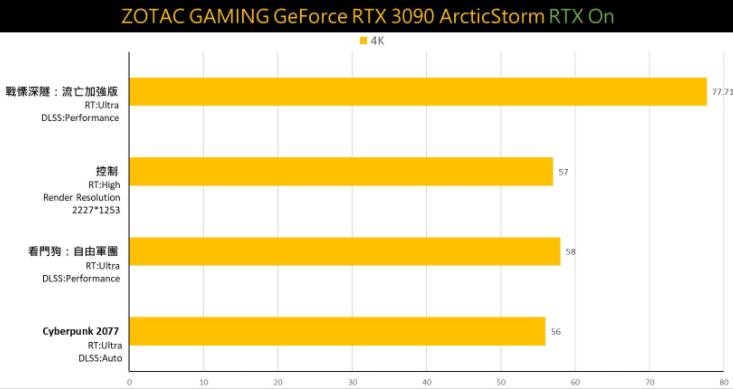 而在各项测试当中,这张RTX 3090 ArcticStorm同时也有着RTX 3090先天硬件优势,在游戏或创作者领域都有亮眼的成绩,例如基本4K特效平均60帧、开启光追与DLSS能到接近平均70帧等实际游戏表现。