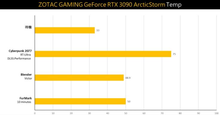 RTX 3090 ArcticStorm待机时仅33°C,而在Bl测试时最高也才55度,不过在游戏时温度有相对较高,像是FurMark高负载测试下也才50°C左右,而游玩《电驭叛客2077》温度最高,超过73度。造成这些落差,可能是因为处理器造成整颗机壳闷烧。