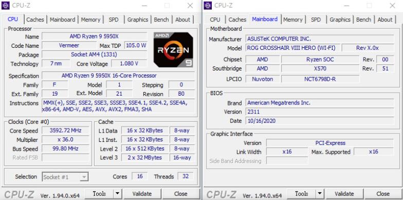 首先,CPU-Z检视AMD Ryzen 9 5950X与5900X处理器信息,代号Vermeer的7nm制程处理器,5950X有着主流平台最高16核心、32线程、5900X则是12核心、24线程,两颗预设为105W TDP热功耗,而CPU温度限制TjMax则是90°C。