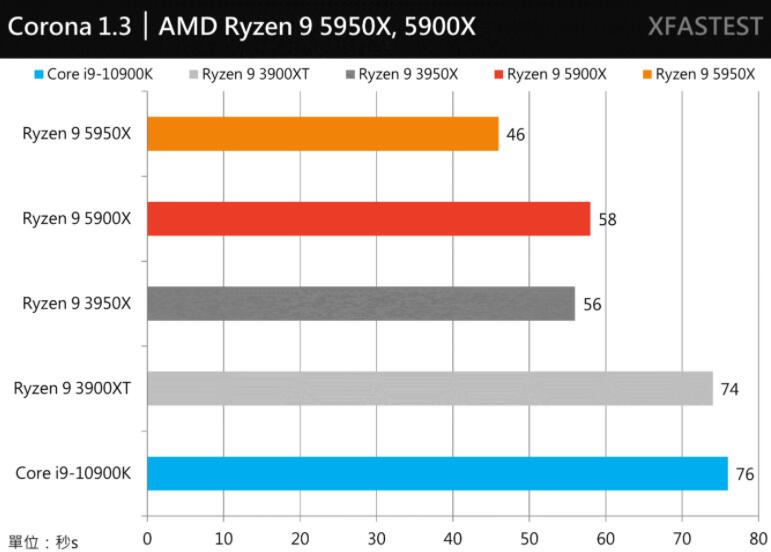 这测试5950X最快46秒完成任务、5900X也有着58秒的成绩,更因为时脉提升、延迟降低后,性能紧追着3950X。
