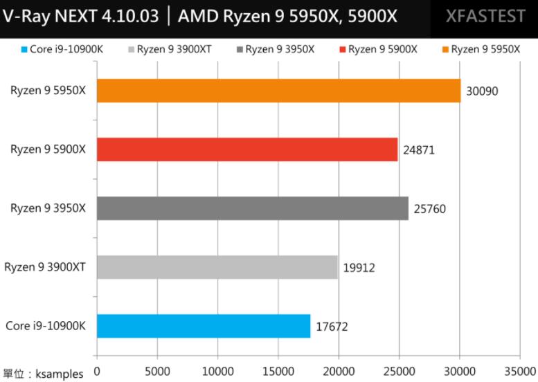 结果同样是5950X拔得头筹30090 ksamples、5900X更以24871 ksamples紧追3950X的性能。