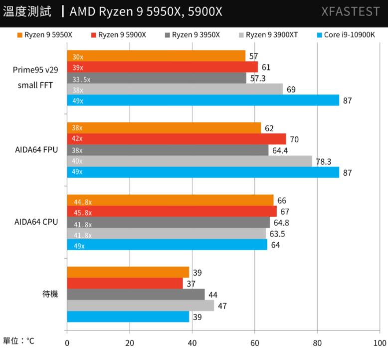 接着AIDA64 FPU压力测试下,5950X 38x与5900X 42x的时脉下温度也比上一代处理器还低,至于Prime95 v29测试两者的时脉又降到更低的状况,因此温度表现都还算不错。