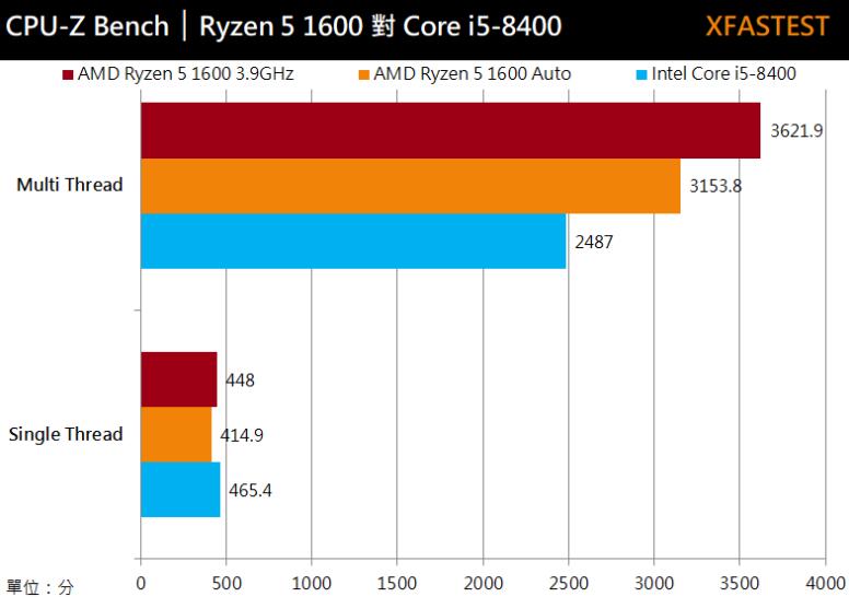 首先对于处理器的单核、多核性能测试,CPU-Z Bench测试中,单核性能上Ryzen 5 1600以414分落后于i5-8400的465分,及使Ryzen 5 1600超频至3.9GHz,也难在单核心表现上扳回一成;但是,多线程的测试上,跑预设时脉的Ryzen 5 1600即轻松赢过i5-8400,超频至3.9GHz后多线程性能更有着显著提升。