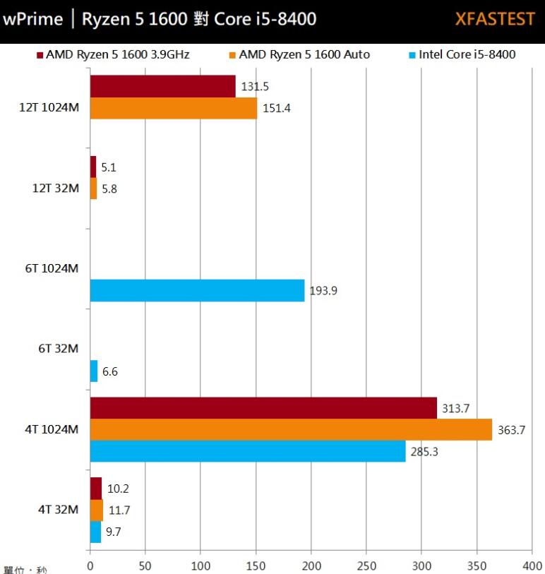 wPrime则是透过多线程计算数学平方根,问题难度分为32M与1024M,计算时间月短著有着越高的性能。在预设4T测试上i5-8400凭着高时脉还是获得领先,只不过当线程改以6T、12T时,可见Ryzen 5 1600支持多线程技术,可让计算时间大幅缩短,提升多核心运算性能。