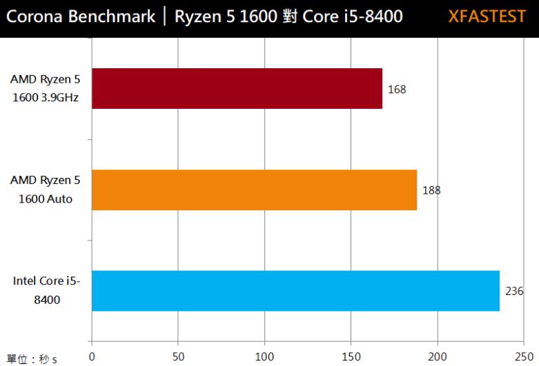 Corona Benchmark则是相当容易操作的测试工具,主要是透过CPU运算光线追踪的渲染图象,评分为计时以秒为单位。从测试结果来看,Ryzen 5 1600预设就有188秒的成绩,在超频3.9GHz后运算速度亦缩短至168秒,比起i5-8400的236秒还快上许多。