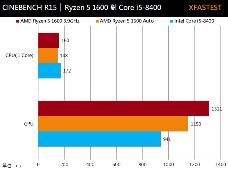 CINEBENCH R15则可测试,处理器单核心与多核心渲染贴图的性能。以单核心测试时,i5-8400依旧领先于Ryzen 5 1600,但当使用多核心测试时则反了过来,Ryzen 5 1600预设有着1150 cb的多核心性能,超频后更来到1311 cb。
