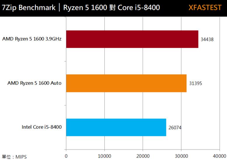7-Zip压缩测试,则是Ryzen 5 1600领先于i5-8400,可见多核心、多线程数高的处理器,在多核心应用上还是有着绝对优势。