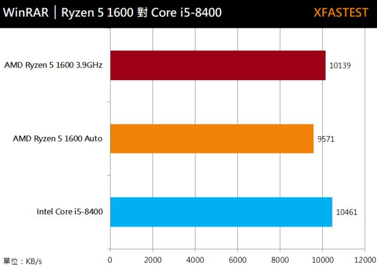 WinRAR压缩软件测试下,Ryzen 5 1600在超频后与i5-8400表现相近,皆有着10000 KB/s的处理速度。