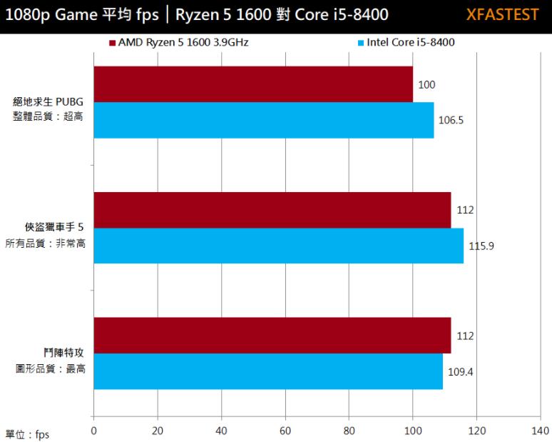 游戏测试,则以《斗阵特工》、《侠盗猎车手5》与《绝地求生PUBG》进行测试,性能表现上i5-8400获得较高的fps性能,但与Ryzen 5 1600差距不到10 fps。