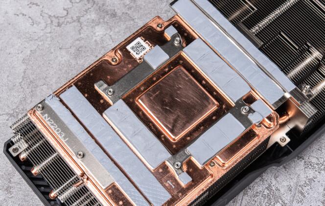 显卡散热器采用均热板直触GPU,并替周围的內存、供电模块散热,上方再复合散热鳍片与8根热导管,将废热引导至前方的散热鳍片,借此获得更好的散热表现。