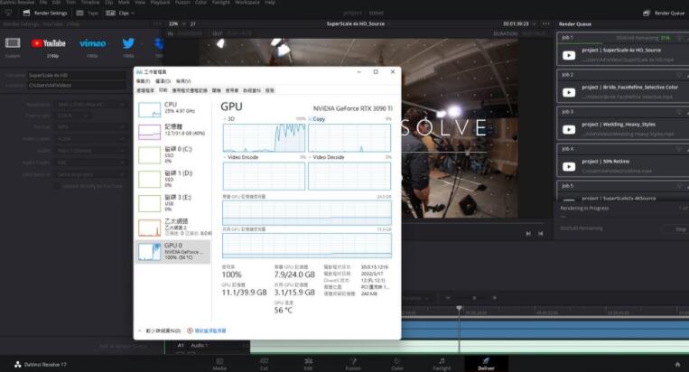 通过RTX 3090 Ti输出图像,SuperScale 4x HD_Source仅花费1分9秒、Bride_FaceRefine_Selective Color仅22秒、Wedding_Heavy_Styles仅29秒、50% Retime仅44秒、SuperScale 2x 4KSource仅16秒的时间。