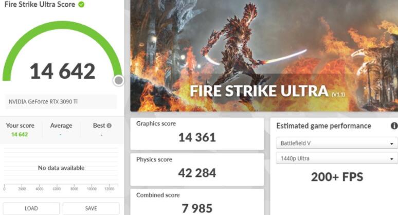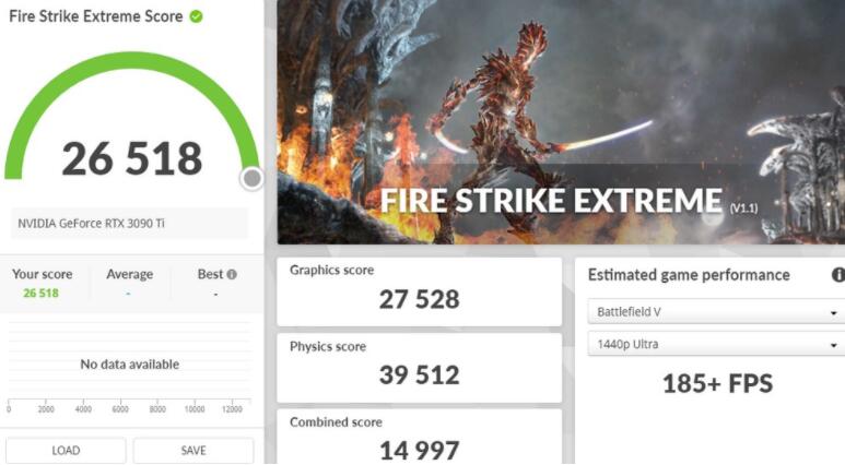 3DMark Fire Strike性能测试,为主流的1080p分辨率、DirectX 11 API的测试情境,RTX 3090 Ti有着42,375分,而1440p的Extreme则有26,518分,更高4K 2160p分辨率的Ultra测试则获得14,642分的成绩。