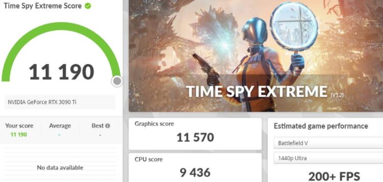 3DMark Time Spy则是采用DirectX 12 API所设计的测试情境,同样是锁定在AAA游戏等级。在1440p的Time Spy测试上,RTX 3090 Ti获得21,844分,而Extreme则获得11,190分。