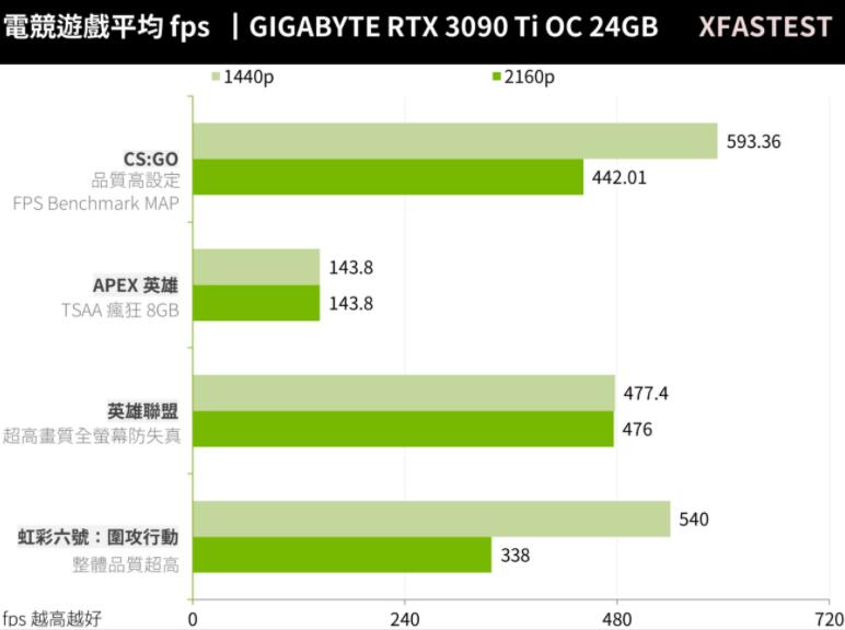 RTX 3090 Ti不论在1440p或2160p等分辨率都可达到300 FPS以上,甚至是4K 400 FPS的电竞游戏性能。