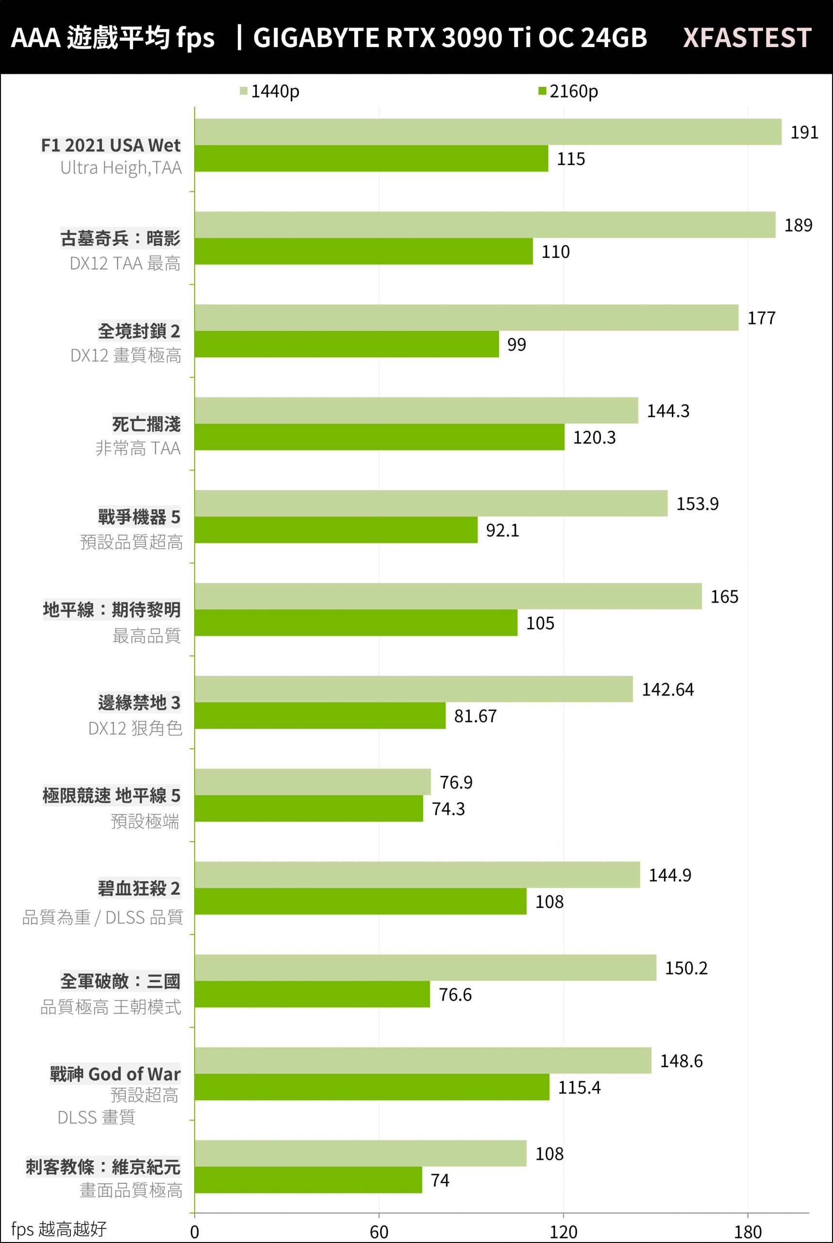 上述12款游戏RTX 3090 Ti在1440p分辨率平均149 FPS、2160p分辨率平均97 FPS的高效能表现,这张卡绝对能满足4K游戏玩家所要求的游戏性能。