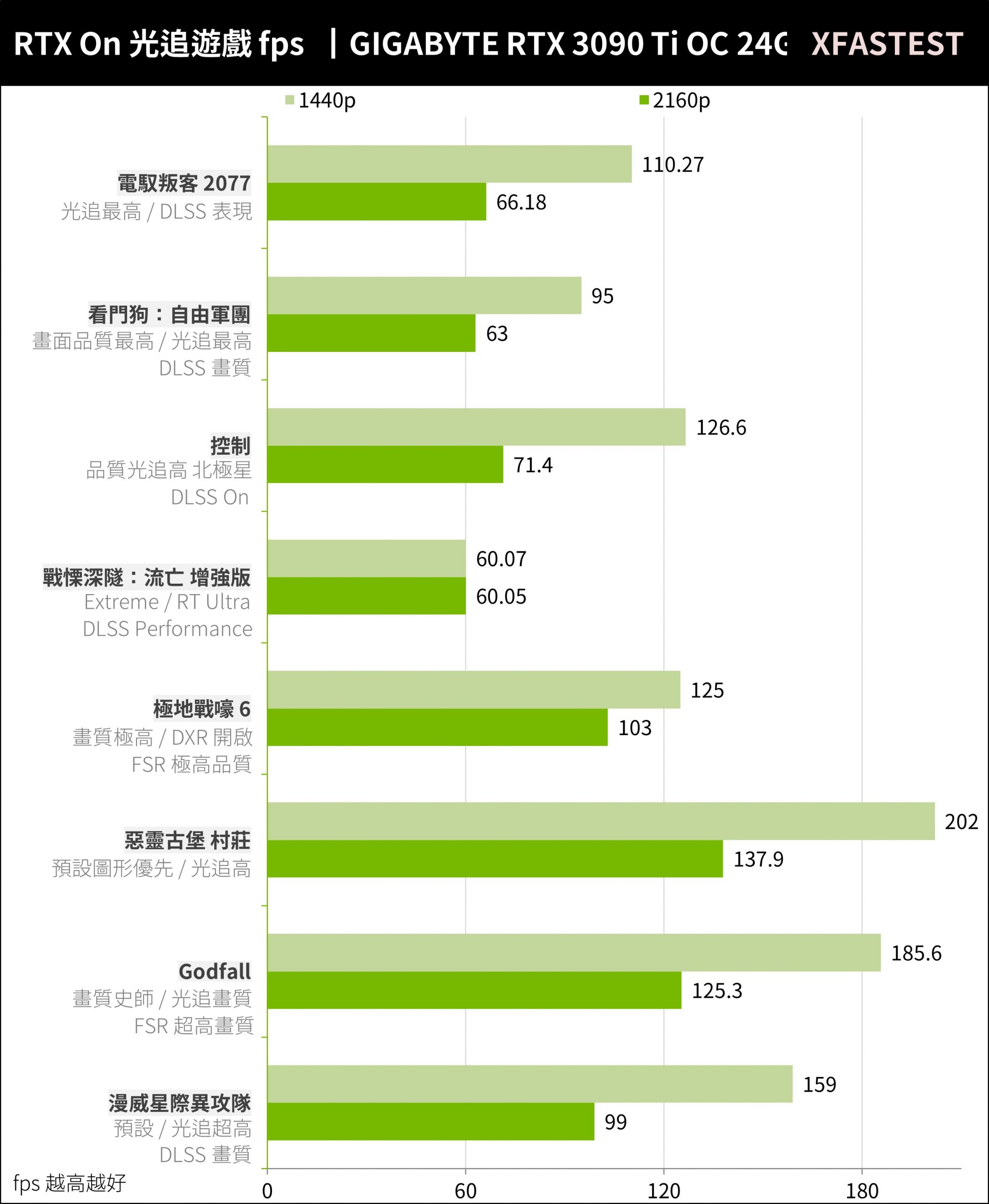 RTX 3090 Ti在这8款光追游戏中平1440p均达132.9 FPS、2160p平均90.7 FPS,同样这张卡不论是在AAA、光追游戏中,都能满足4K游戏玩家的性能需求,一张比起RTX 3080 Ti、RTX 3090还要强的4K游戏卡皇。