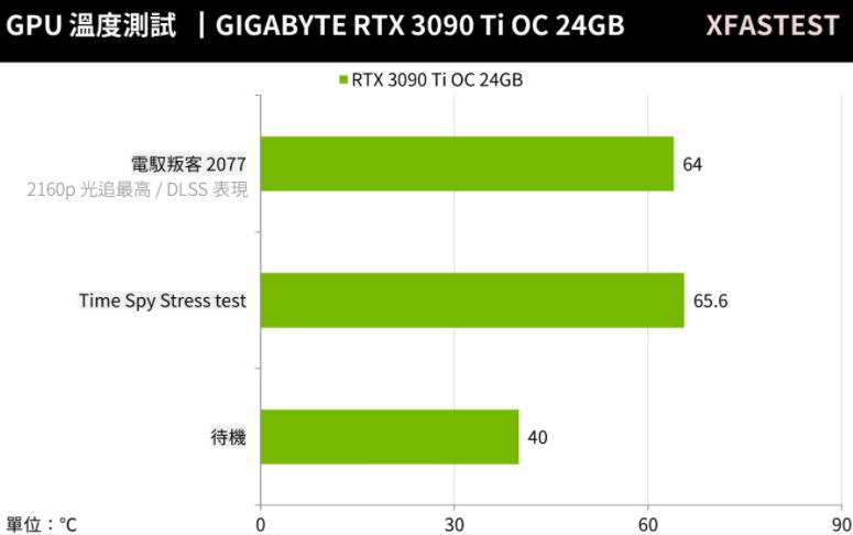 首先GPU温度方面,GIGABYTE RTX 3090 Ti GAMING OC 24G支持0dB风扇,待机时风扇停转GPU温度则在40°C,Time Spy压力测试最高来到65.6°C,而游戏测试时则在64°C的温度表现,对于这颗完整核心与超频的GA102 GPU来说,这散热表现已相当出色。