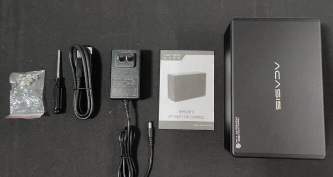 ACASIS DT-3608外盒就是简单的纸盒,正面印有品牌名称,背面有型号与规格信息。内容物有数组盒本体、说明书、变压器、USB 3.0传输线、起子、螺丝,变压器支持100–240V的国际电压。