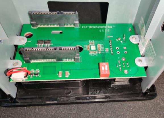 预设为JBOD模式,需要自行拨动开关调整成RAID 1模式,可参考说明书。