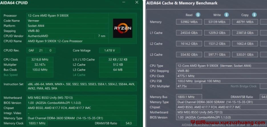 使用AMD Ryzen 9 5900X测试,內存读写可以达53000 MB/s以上,延迟在60.8ns。