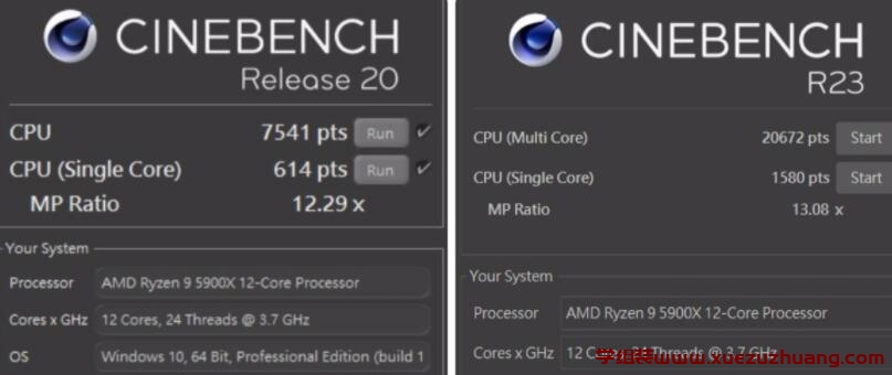 CINEBENCH R20,单核心614 pts、多核心7541 pts,CINEBENCH R23,单核心1580 pts、多核心20672 pts。