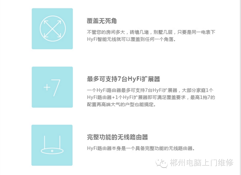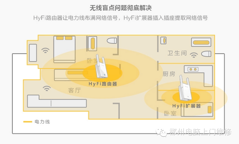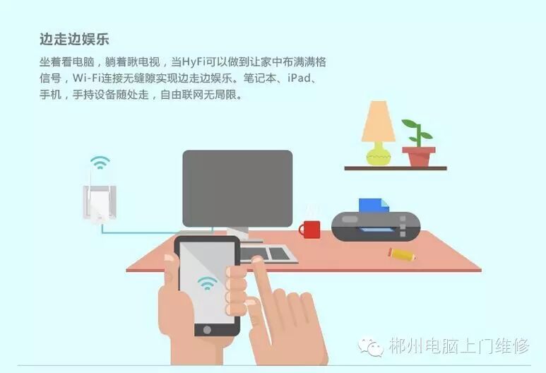 采用 “有线”和“无线”两种技术,以“有线”为主干,“无线”作为扩展,使产品兼具有线的稳定可靠性和无线的移动便捷性,实现家庭等区域的无线完全覆盖。优点:无需布线,无需切换信号(同一信号),辐射更小。