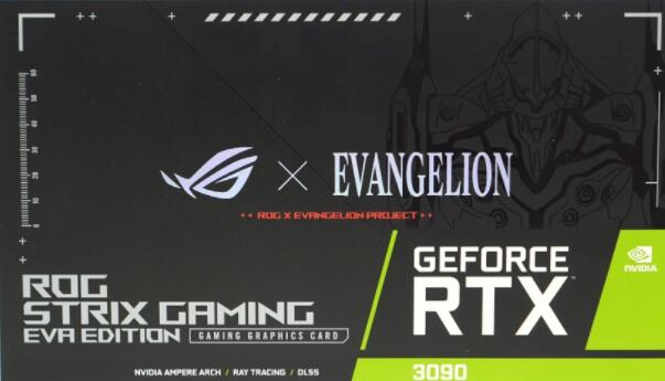 颜色采用黑色点缀灰色测量装饰外框、数值刻度装饰与产品名称标示等文字,因为是NVIDIA RTX 3090,所以融入NVIDIA的绿色与白色要素。与主板包装相同的设计概念,正面是正面看着你的初号机线图,背面是初号机手拿高振动粒子刀的侧身像,都小了一点,不同的是这次背面没有初号机象征标志。