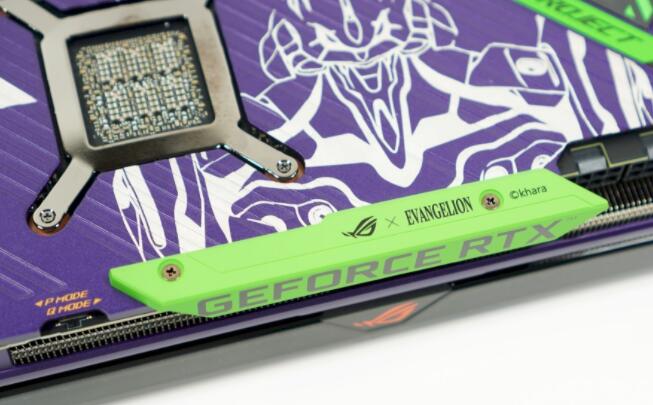 3组8 Pin旁的绿色装饰让显卡更有立体感,让我联想到EVA 01初号机的鞋舌XD,上面有ROG X EVANGELION、版权Khara文字和GEFORCE RTX文字。