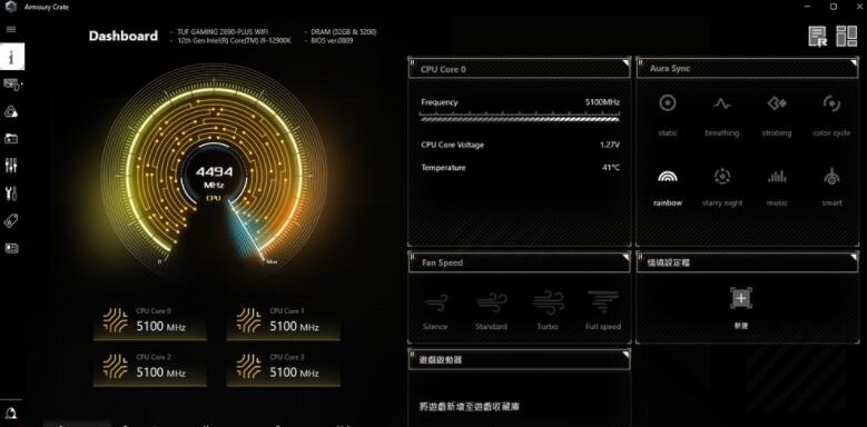 新版ROG Armoury Crate仪表板有着电脑的基本信息,可以监控CPU时脉、电压、温度等功能,也可调整主板的风扇模式,提供静音、标准、Turbo与全速的风扇控制功能,并可调整电脑的AURA Sync同步灯效。